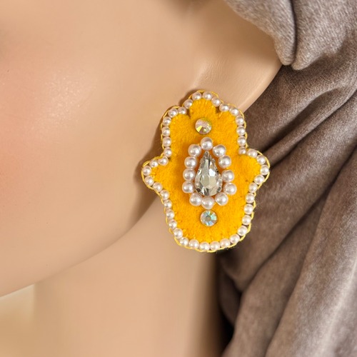 ビーズ刺繍のハムサピアス(ミニ) イエロー ¥2,300 ※こちらの価格には消費税が含まれています。 ※別途送料がかかります。送料を確認する 送料・配送方法について この商品の送料は、配送方法によって異なります。 配送方法は、ご購入時に選択することができます。 ¥15,000以上のご注文で国内送料が無料になります。 レターパックライト 全国一律 ¥430 定形外郵便 保障や追跡サービスがないことを予めご了承ください。 全国一律 ¥300 クリックポスト 日本郵便が提供する小型の荷物専用の配送方法です。荷物追跡に対応しています。 全国一律 ¥250 ※¥15,000以上のご注文で国内送料が無料になります。 数量 1 数量 1 カートに入れる 再入荷のお知らせを希望する 年齢確認 再入荷されましたら、登録したメールアドレス宛にお知らせします。 メールアドレス 折返しのメールが受信できるように、ドメイン指定受信で「thebase.in」と「gmail.com」を許可するように設定してください。 登録する 再入荷のお知らせを希望する 再入荷のお知らせを受け付けました。 ご記入いただいたメールアドレス宛に確認メールをお送りしておりますので、ご確認ください。 メールが届いていない場合は、迷惑メールフォルダをご確認ください。 通知受信時に、メールサーバー容量がオーバーしているなどの理由で受信できない場合がございます。ご確認ください。 折返しのメールが受信できるように、ドメイン指定受信で「thebase.in」と「gmail.com」を許可するように設定してください。 閉じる 通報する 濃い目のイエローとパールが可愛いです。 ハムサの大きさ:4×3㎝ ポスト:チタン キャッチ:チタン 生地:フエルト ハンドメイド品の為、左右差やいびつさ、 接着剤のはみ出しなど多少ございます。 ご了承くださいませ。 ショップの評価 すべて 88 2 0